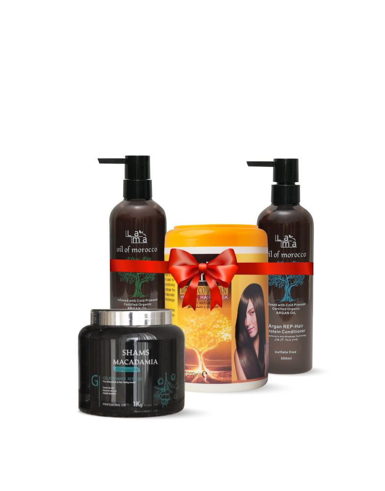 مجموعة معالج الشعر بالمكاديميا والجلاتين + شامبو وبلسم + حمام زيت هدية